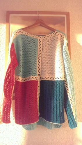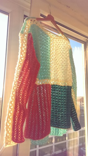 Так по дизайнерски получилось:) Вас пусть разноцветие не пугает, в Англии подруга живет, там часто такие светерки носят:))