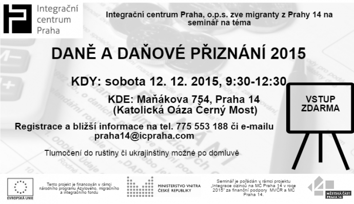 Seminář je pořádán v rámci projektu «Integrace cizinců na MČ Praha 14 v roce 2015» za finanční podpory MV ČR a MČ Praha 14.