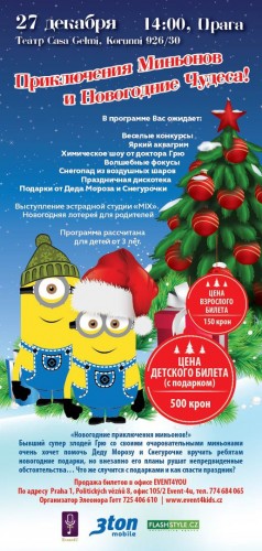 Профессиональный театр, наши актеры приготовили для ваших детейДетский спектакль-сказку, Наши сказочные герои ,увлекательный сюжет ,поведут за собой в сказочную атмосферу Новогодних Чудес. После спектакля, вас ждет развлекательная программа с Дедом Морозом и Снегурочкой.Стоимость билетов : 250 крон( без подарка, родители могут принести подарок с собой, который наш Дед Мороз подарит вашему ребенку)