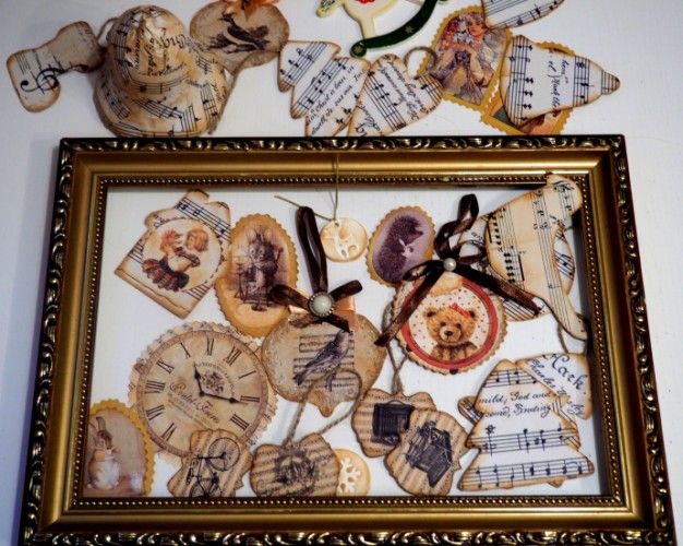 Вот еще идея, в прошлом году захотелось винтажного стиля, сделали с ребенком подвески в«состаренном» стиле.Обычная ксерокопия на цветном принтере, края обработаны губкой для скрапбукинга