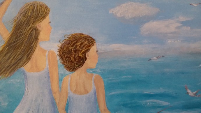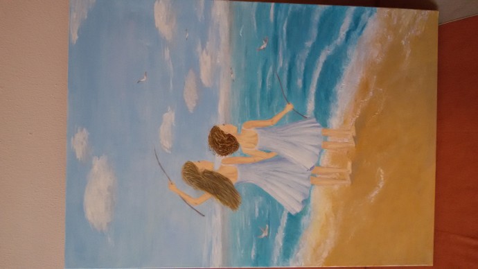Спасибо, натурщицами были мои девочки, да:)) Только младшая светленькая у меня. А идею мне сестра подкинула, эта картина — собирательный образ сестер, стоят они вместе, каждая думает о чем-то своем, но все равно они рядом и вместе (поэтому младшая девочка темненькая, как ее дочка). Вот. Подарю ей на день рождения. Пусть криво, но от души:))) Она заранее в восторге.