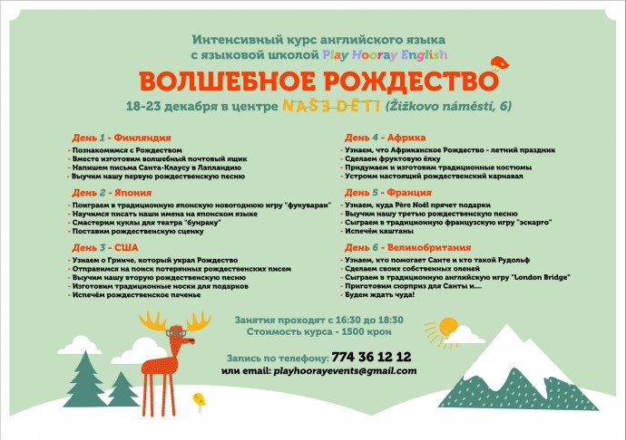 В эти праздничные дни мы приготовили программу интенсивного английского для детей от 4 до 10 лет. Это очень интересный, насыщенный и интерактивный курс занятий, которые будут проходить каждый день, с 18 по 23 декабря, с 16:30 до 18:30 в центре Nase Deti.