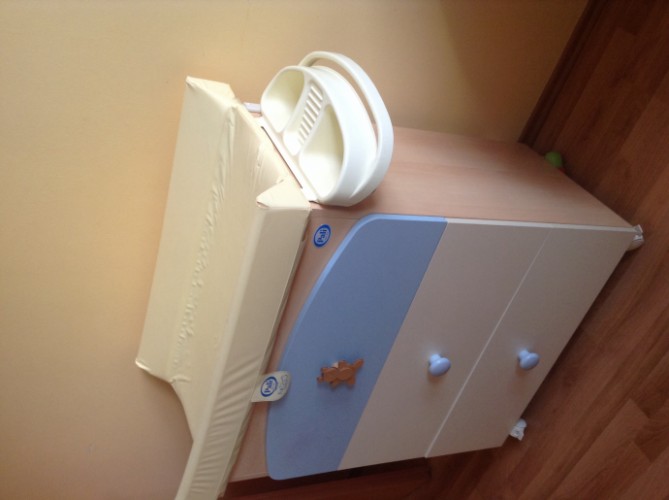 Три полочки, встроенная анатомическая ванночка! (можно вынуть и использовать отдельно), на колесиках — двое из них блокируются. То есть, например, можно отвезти в ванную, заблокировать колесики, там выкупать ребенка, а потом привезти обратно в комнату.