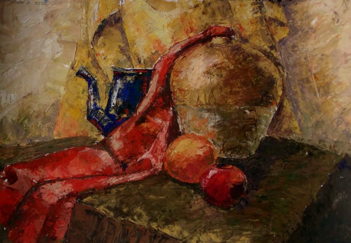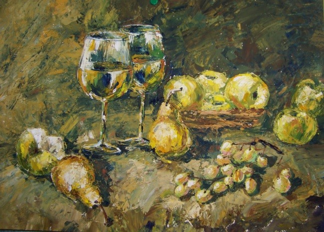1. Натюрморт «Бокал красного» 47*37 мастехин, картон, акрил, рама, 1200 крон