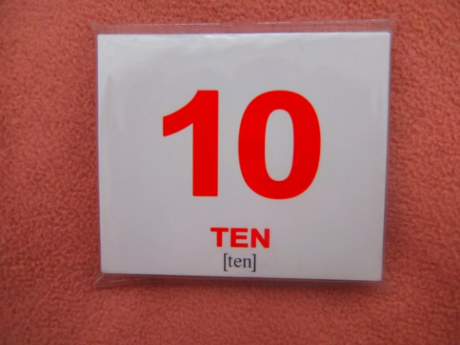 - Двухсторонние карточки познакомят малыша с миром цифр и чисел. На одной стороне числа на белом фоне, подписаны на русском языке. На другой стороне изображена та же картинка, но с подписью на английском