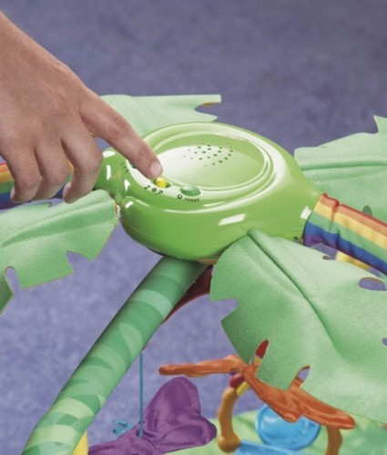 - Внутри разноцветного тукана есть погремушка, а разноцветные атласные бабочки порхают под зелёными листиками на верёвочках.