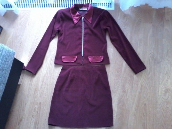 Костюмчик, М-ка.20 крон, цвет красивый красный.Фото не передало.Наверное, велюр.Я в тканях-не спец((((