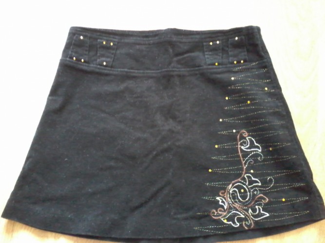Юбка, наверное, вельветовая, размер написан 48.Тоже М-ка.Цвет чернее, чем на фото.20 крон