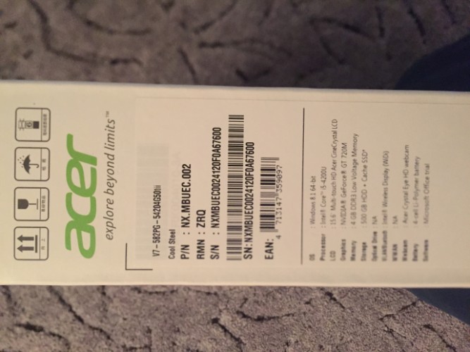 V7-582PG-54204G50tii — Windows 8.1 64-bit - Intel® Core™ i5-4200U — 4 GB DDR3 Low Voltage Memory + N — 500 GB HDD + Cache SSD + N — SD card reader — N — 15.6« Multi-touch HD Acer CineCrystal LCD — Chipset none NB Chipset — NVIDIA® GeForce® GT 720M 2G-DDR3 (256*16*4) — Intel 802.11/a/g/n+BT — Acer Crystal Eye HD webcam — 4-cell Li-Polymer battery — 3-pin 90W AC adapter — backlight — Iron IMR F345A