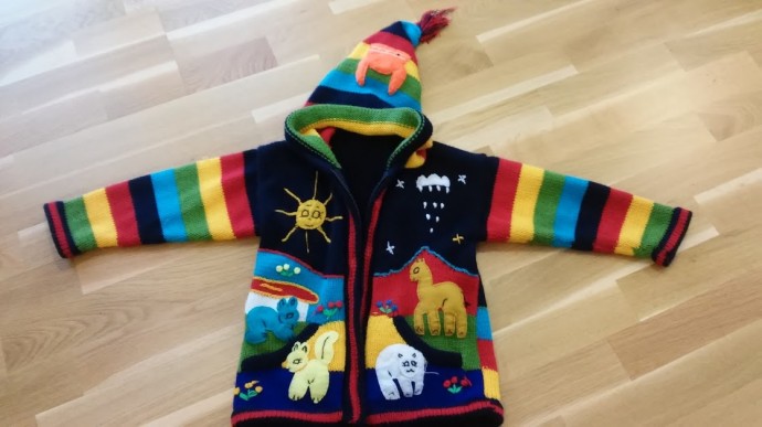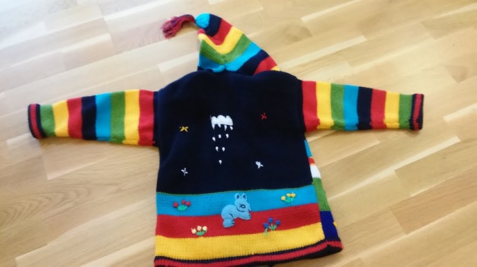 5. Кофта вязаная с капюшоном, черная с рисунком, рост примерно 104-110см, 300 крон