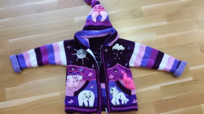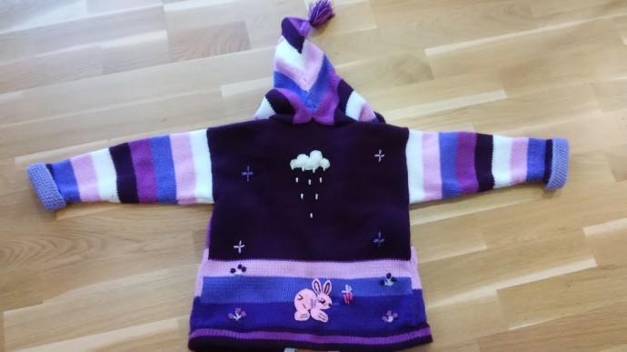 4. Кофта вязаная с капюшоном, сиреневая с рисунком, рост примерно 104-110см, 300 крон