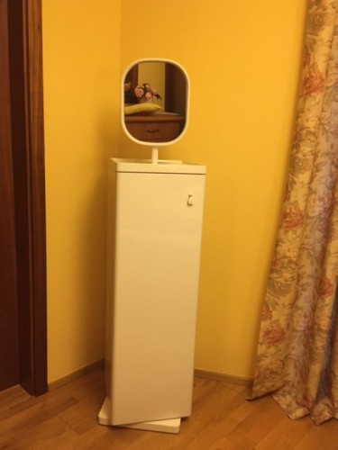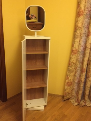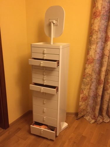Башенка вертится, с одной стороны много ящичков, с другой — полки. Зеркало тоже крутится.