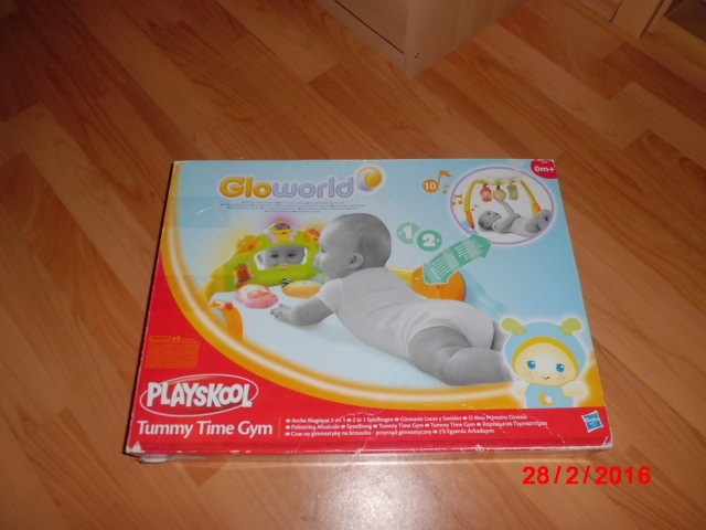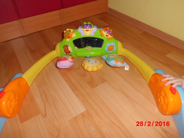 Игровая арка, 2 положения - ребенок может играть лежа на животике, а можно поставить вертикально как арку и ребенок играет лежа на спинке. Нам помогла научиться вставать. Зеркало, вибрирующая и музыкальные подвески, мигающие лампочки-жучки сверху. Можно включить на постоянную музыку, можно на реакцию на прикосновение к подвескам. Надо заменить батарейки (пальчиковые).С коробкой.
