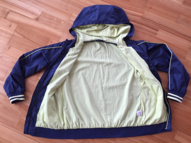 Ветровка Orchestra. Французский размер написан 14/164 см, но мы носили как 12/152. Непромокаемая, темно-синяя, салатовый подклад, капюшон не отстегивается. Цена 180 крон.