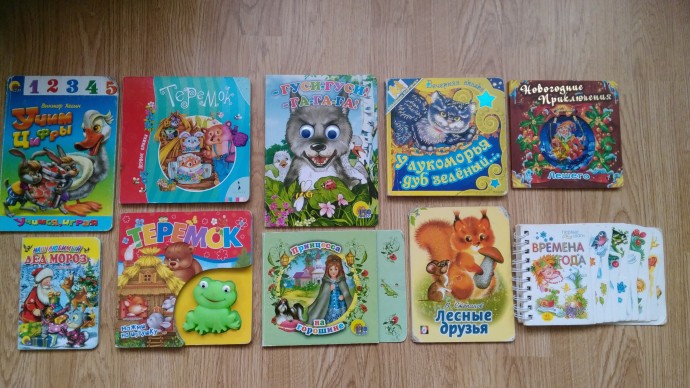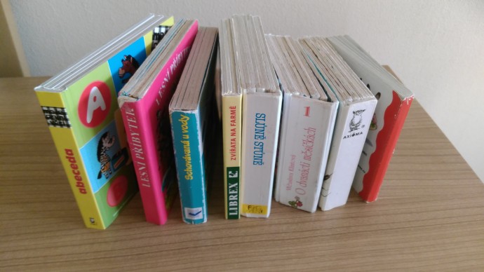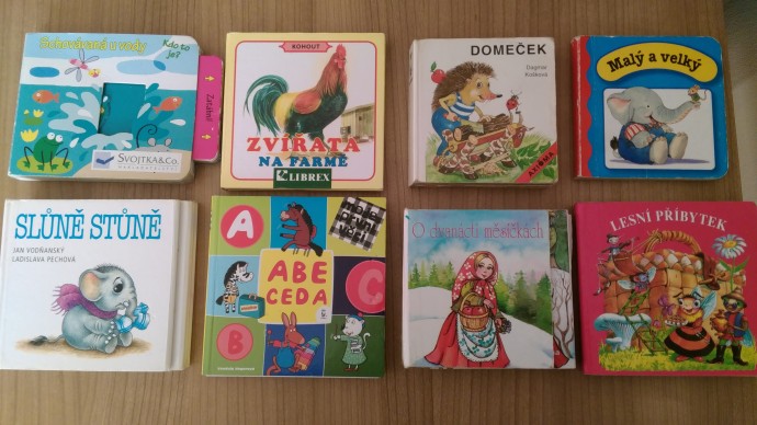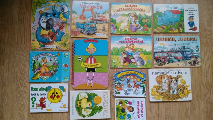Добрый день, могу предложить Вам вот такие картонные книжки для детей. Наши уже выросли.Состояние книжек разное, некоторые новее, у любимых — края стерты. 30 — 20 крон за штуку. Если заберете все сразу, эти в подарок.