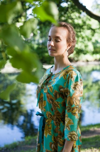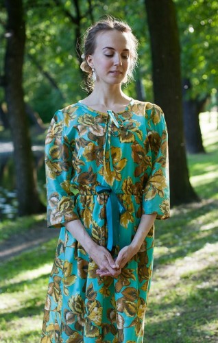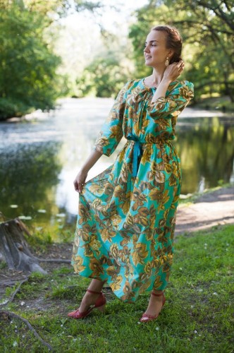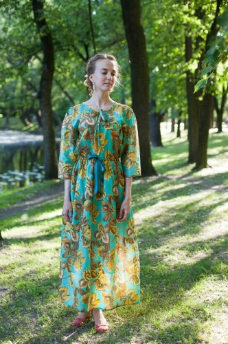 Очень тоненькое и лёгкое, идеально для жаркой погоды. Хлопок, сшито из советской ткани. Длина — 113 см, талия — 92 см, грудь — 92 см. Длина рукава — 28 см.