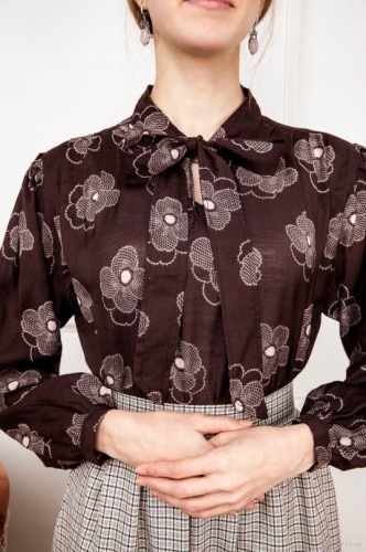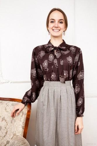 Блуза тёмная: сшита из советской ткани. Хлопок. Очень приятная к телу ткань. Ширина 104 см, длина 59 см, плечи — 41 см от рукава до рукава, длина рукавов 57 см, застёжка на манжетах пришивается в зависимости от ширины запястья заказчика.