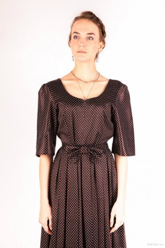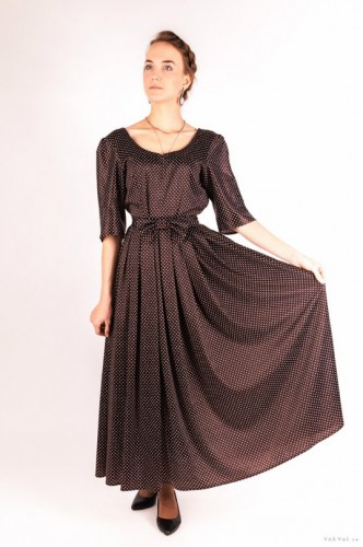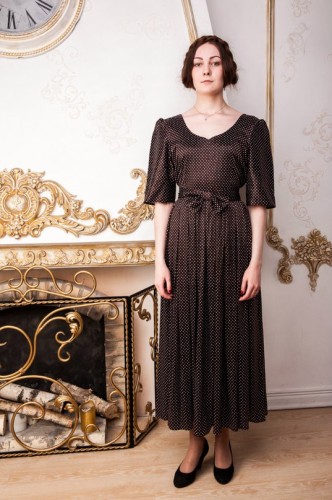Объём груди 98 см, талия 81 см. Длина от талии 93 см. Рукав 37 см длиной, лёгкая сборка сверху. Отрезная юбка с заложенными складками. В бок вшита потайная молния. По груди вырез сердечком) Длина по спинке 42 см. Окружность подола примерно 310 см.