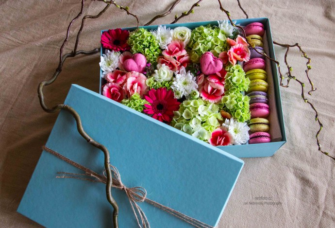 И не забываем про нарядные коробочки с цветами и макаронс!