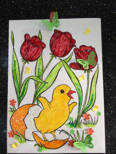 Все остальное фантазия -пример готовой картинки-аппликации и открытки, раскрашивайте всем что имеется, (в моем случае это акриловые краски на стекло)