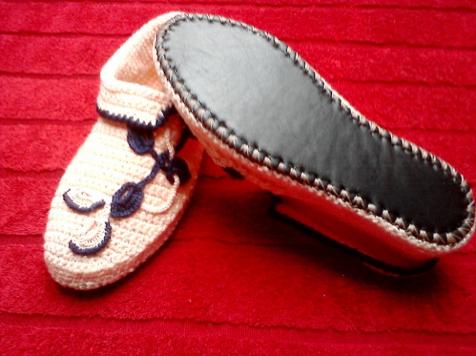 Тапочки женские. Длина 24 см. Ручная работа. Материал- акрил, войлочная основа, обшита кожзаменителем. Цена 400 крон