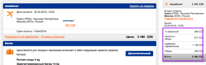 Если все тоже самое забронировать на сайте самой авиакомпании, то их цена включая все сборы выходит 3 180 крон. Прилагаю фото. Кстати, не уверена, возможно они еще взимают сбор за оплату картой, это тоже бывает как правило порядка 100-150 крон. А на сайтах подобных skyscanner при оплате картой всегда взимают сбор. Кроме того, ту цену, которую вы видите на первом этапе, это просто минимальная стоимость, эта цена не всегда действительна. Об этом вы узнаете только когда начнете бронировать. Ну а потом, когда вы столкнетесь с вопросом изменения даты вылета у вот таких авиакомпаний, у которых рабочие дни только в будни и до 17), телефон всегда занят и представительнство в Германии или Австрии, например, а все у вас должно решаться мгновенно и как правило на выходных, вот тогда вы ощутите всю прелесть покупок билетов через интернет. В этот момент Вы вспомните про экономию в 88 крон и поймете, что нервы вам дороже обходятся. Я никого не переубеждаю. Объясняю тонкости данной сферы деятельности. Надеюсь у меня получилось хоть немного прояснить ситуацию.