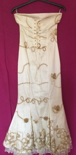 Девочки, продаю нарядное платье. Одевала буквально 2 раза на две свадьбы. Размер 36, по фигуре, ручная работа, прошито золотой нитью, корсет и подъюбник. Цена 1500 крон.