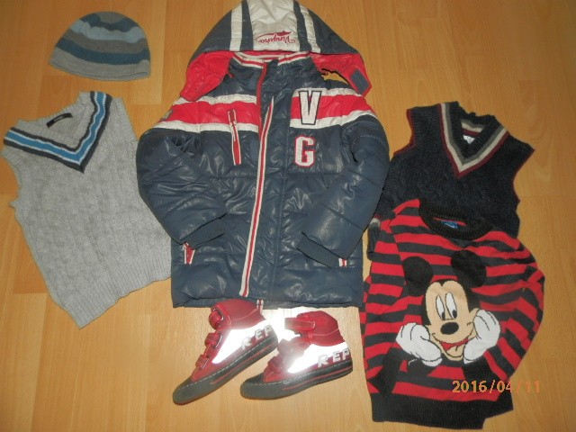 Кеды размер 29, но запросто как 29-30, кожаные Реплай цена 700крон. Микки свитерок 150 крон, размер 104, длинна 48см, рукав от шеи 47см, фирма Маркс энд Спенсер. Куртка весенняя Винджино, Италия, размер 5лет, длинна 50см, рукав от капюшона 50см, 750крон, если возьмёте всё будет скидка.