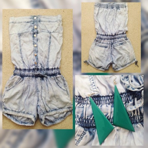 Джинсовый комбинизон, размер S — 150 крон + сережки в подарок.