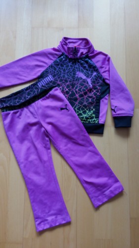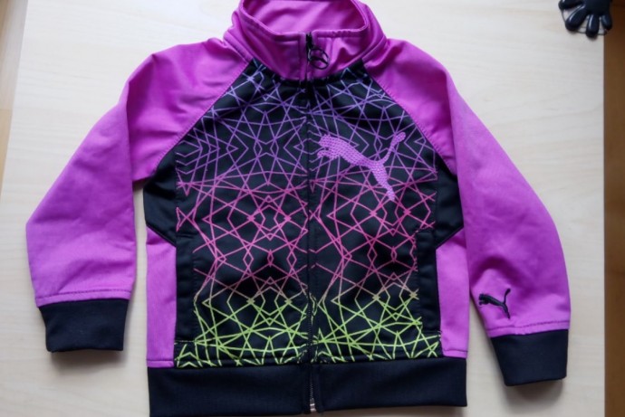 Стильный, очень яркий и красивый костюм на малышку 2-3 лет. в отличном состоянии. Брюки — шаговый — 36 см. Мастерка — длина по спинке без учета стойки — 34 см. Цена 200 крон