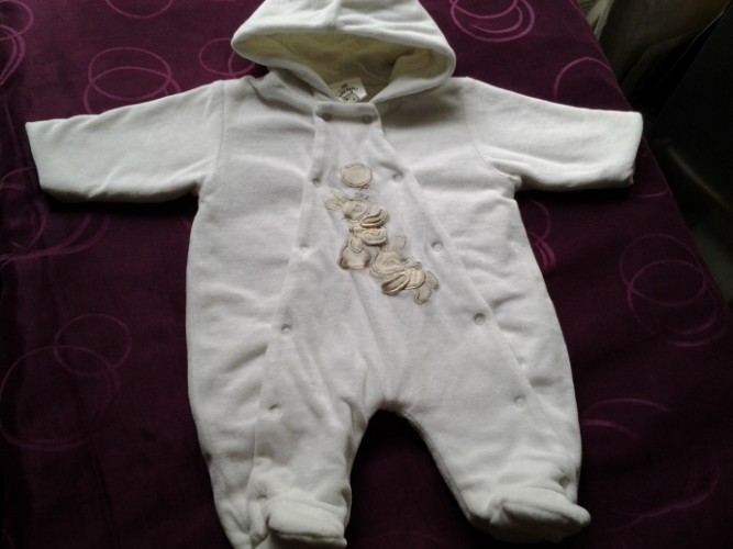Белый велюровый, удобно застёгивается и красиво смотрится на ребёнке.