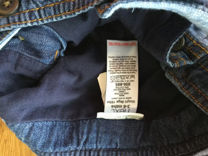2. Джинсовые штанишки Next, размер 3-6 мес. Неношеные, не стиранные, не успели поносить. Подшиты х/ б, полностью расстёгиваются для смены памперса. Длина 54, длина от пояса 34 см, от мотни 15 см. Цена 120 крон.