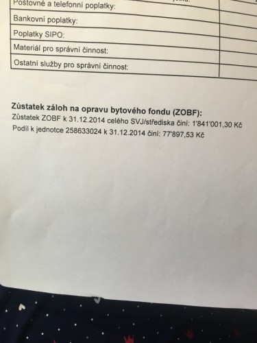 У нас такая же проблема не первый год, большие суммы «недоплатэк» в конце, хотя каждый год повышаем поплатки ежемесячно. Решила подсчитать всю годовую сумму взносов, что я делаю. И вот, что я обнаружила, сумма моих взносов на 20 тыс крон (каждый год по-разному, +-) отличается от тех, что выставили мне в залогах, в фактуре перерасчетов. Спрашивается куда делись мои внесенные деньги? Вот жду в этот раз перерасчет за 2015 год и пойду выяснять.