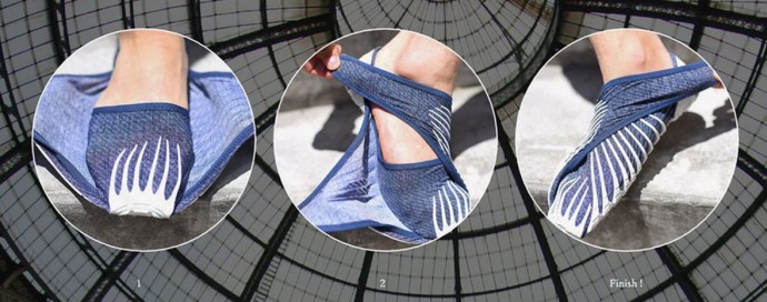 Эта обувь без шнурков. Таким образом, получившаяся конструкция напоминает не то кроссовки, не то портянки.