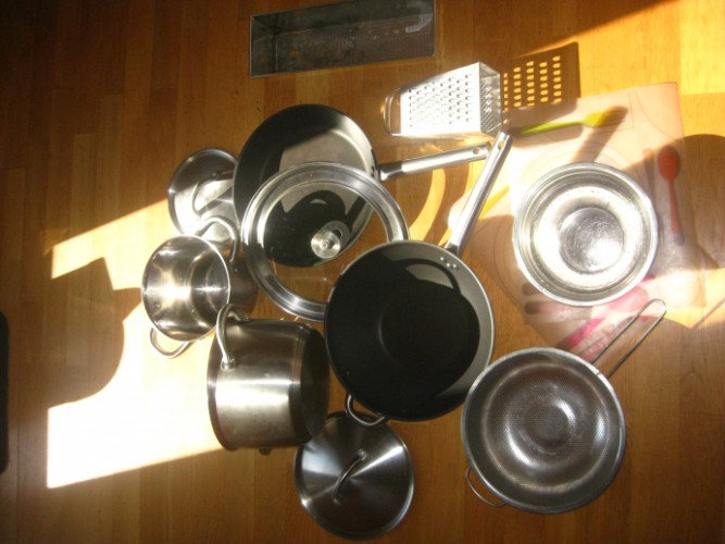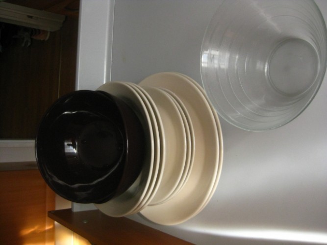 5. Посуду полный комплект (2 кастрюли+2 крышки , сковорода+крышка под обе сковороды, сковородка — Wok, терка, набор посуды из 3-х больших тарелок, 4-х маленьких, 4-х глубоких супных, 3-х фиолетовых также под суп, 2-х прозрачных салатников, жестяной нержавеющий салатник) за 1500 крон.