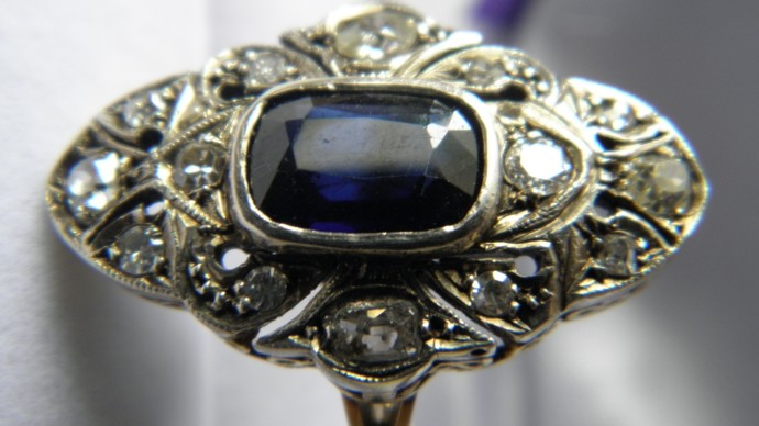 Если кратко — типичное кольцо периода Арт-Деко (+- 1915), скорее всего золото 14-18 карат либо, что также может иметь место быть, а, соответственно, увеличивать стоимость, платина. Посмотрите на внутренней стороне шинки (колечка), либо каратность (может быть и европейский вариант, например, 585), либо, если платина, то обозначение irid.plat/ plat/ 950 (возможны вариации). Похоже на то, что сапфир настоящий, что здесь, в Чехии, КРАЙНЕ сложно найти, ибо тяга местных старожитников ко смене камней в ювелирке поистине не ведает границ ;-). Предполагаю, что камни (и сапфир, и бриллианты по умолчанию) настоящие, естественно, старой огранки. Кольцо предположительно размера 15-15, 5 , соответственно и размеры камней не очень крупные, но, опять-таки, если сапфир настоящий (все-таки предмет необходимо держать в руках), то кольцо имеет стоимость. Итак, минимальный расклад: золото 14 карат, искуств. сапфир и брилл. — действительно стоимость лома. Сапфир настоящий (качество!) + брилл. + золото — стоимость от 8000 крон. Ну а если платина, то сапфир must be real ;-), стоимость мин. 12000.