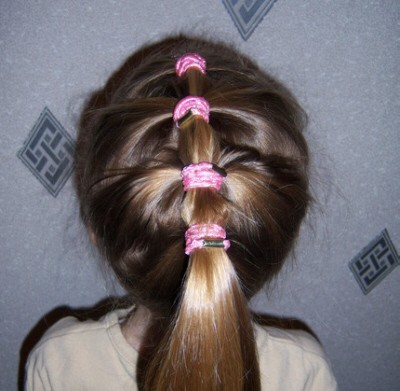 Только резинок использую в два раза меньше и беру маленькие бесцветные)))Тоже делаю на 3-4 резинки и еще каждый хвостик проворачиваю во внутрь. Получается почти колосок