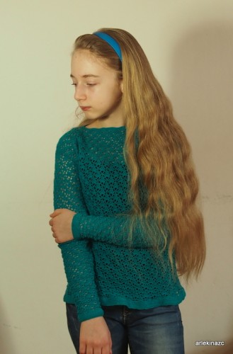 Еще многое от волос зависит. У дочки нет челки, волосы одной длины, волнистые. Часто заплетаю ей такую косу, только волосы собираю высоко на макушке.