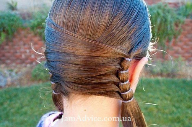 Если волосы большие уже, то пора открывать инет и учиться плести rybi cop, всякие там косы наискосок, быстро и красиво — маленькие хвостики, переходящие один в другой через всю голову от уха до уха.