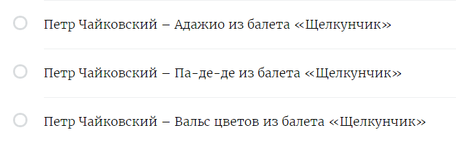 А у меня получился тест на знание музыкальных произведений Щелкунчика :)