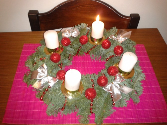 Уже даже первая свечка вся сгорела, а я только решила показать венок. Мне кажется, что если венок делает ребенок, то плохо просто не может получится. Мне нравится. Уюта вам в эти недели, терпения, покоя и хорошего настроения. Чтобы все плохие люди проходили мимо вас, чтобы сплетни и злость не замечали вас. Светлое время, светлые дни, светлые мысли. :-)
