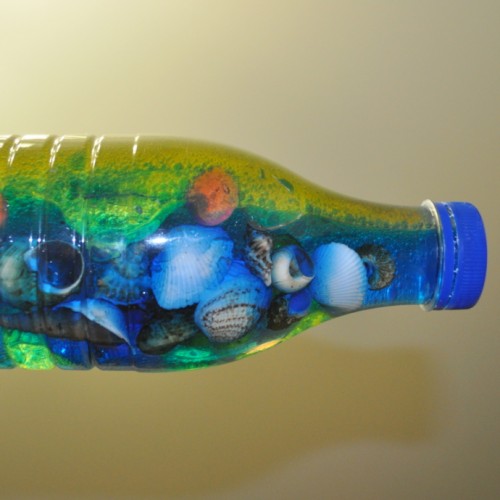 Бутылка должна быть прозрачной, ее наполните водой на треть. Добавьте пару капель синего пищевого красителя, чтобы превратить воду в морские глубины. Добавляем в бутылку морские атрибуты, а далее наливаем растительное масло. Заполняем им оставшиеся 2/3 бутылки. Следует очень плотно закрыть крышку, чтобы жидкость не разлилась при переворачивании, а также, чтобы ребенок не смог ее раскрутить. Для этого приклейте крышку или примотайте скотчем.