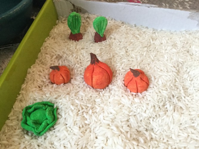 Я своей делала из аэроглины вот такой огород. Можно потом раскрасить, а можно в глину добавить пищевых красителей.