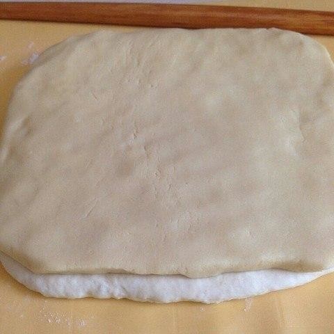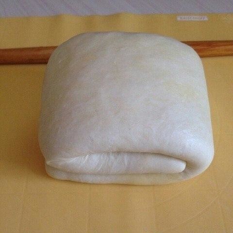 6. Вновь раскатать в пласт и сложить конвертом. Повторить процесс складывания/раскатывания ещё 2 раза.