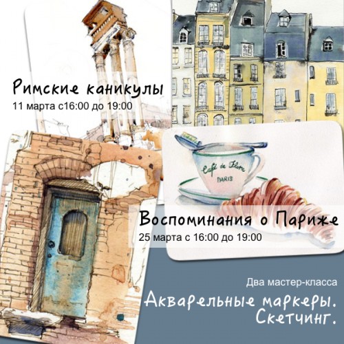 25.03 — “Воспоминания о Париже”. Рисуем фасад парижского дома и французский завтрак. Материал: акварельные маркеры, акриловый линер.