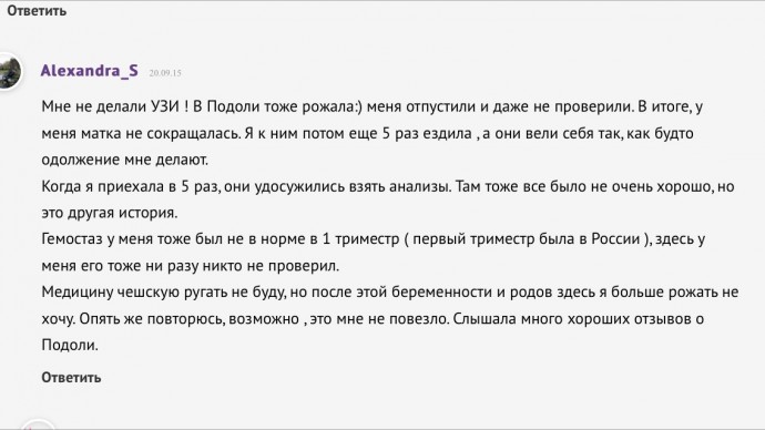 Я не сказала лучше, я сказала хорошая. Чего бы мне Россию ругать, я сама туда поехала из распрекрасной Чехии))) Не скажу, что жалею, но так сложилось. Имея сегодняшний опыт, уже не поехала бы точно)) Везде есть свои + и -. Поэтому и написала — у каждого своя история. Не видеть достоинств чешской медицины тоже странно, знаете, от скольки граммов тут детей вынашивают?! Просто диву даешься. Россия очень разная. Хотя я сама по этой части только в Москве имею опыт. Но впервые придя на УЗИ в МОНИИАГ после моего чешского врача, мне показалось, что там всё дореволюционное...Про отношение я вообще молчу. У нас гинекология традиционно грубая. Помню, как моя коллега плакала после посещения гинеколога в дорогой клинике в Москве!!! От хамства врача.