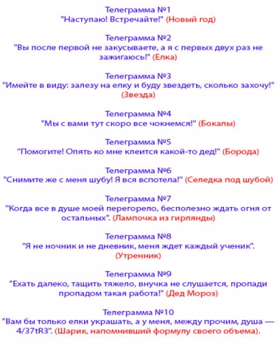 девочки, подскажите пожалуйста интересные сценарии новогоднего вечера с друзьями (большая веселая компания), имею ввиду интересные конкурсы. В интернете смотрела, много чего есть, кое-что подчерпнула, но вдруг найдется что-то мега интересное! Я думаю многим пригодится. Хочется веселого праздника!