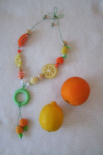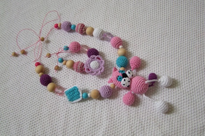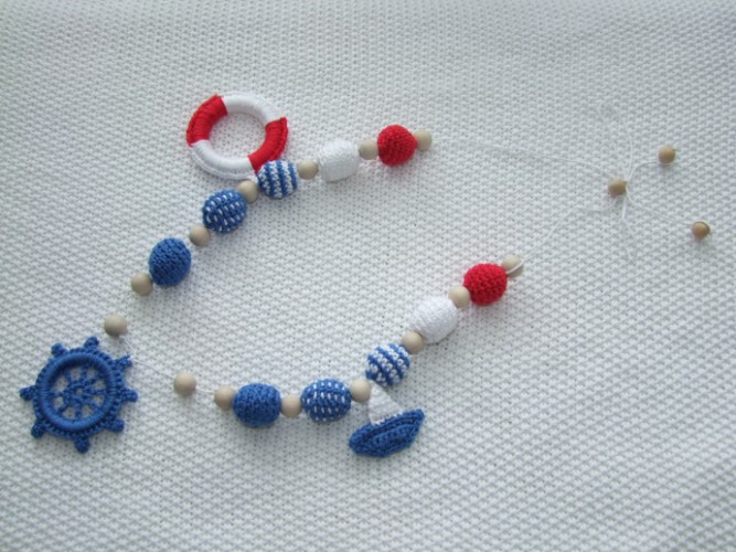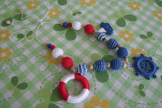 Слингобусы на вощеном шнуре, бусины из хлопковой пряжи, общая длина бус — 105 см, темно-синие бусины звенят, остальные бусины — мягкие. Первые две бусины от штурвалов — можно перемещать по шнуру. Штурвал в диаметре 5 см. Спасательный круг — 6 см (внутри деревянное кольцо). Внутри синей части кораблика 2 крупные бусины, которые малыш может пальчиками нащупать и передвигать.