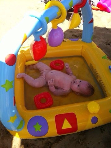 Еще нам пришлось купить маленький надувной бассейн. Вода в море оказалась не настолько теплой, как мы думали. Поэтому купили бассейн, брали его с собой на пляж, наливали туда морской воды и ставили на солнышко. Водичка быстро прогревалась и можно было купать там малыша:)