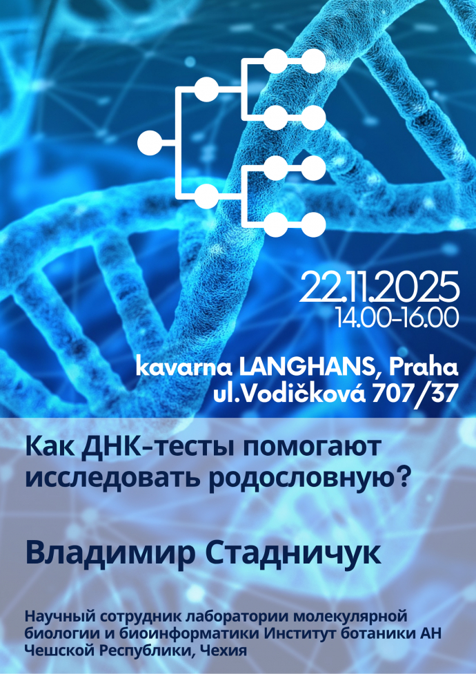 Я пригласила прекрасного спикера — сотрудника Академии Наук Чешской Республики генеалога Владимира Стадничука, который расскажет нам об азах ДНК-генеалогии и поможет разобраться со всем разнообразием возможностей в использовании ДНК-тестирования для восстановления истории своей семьи.